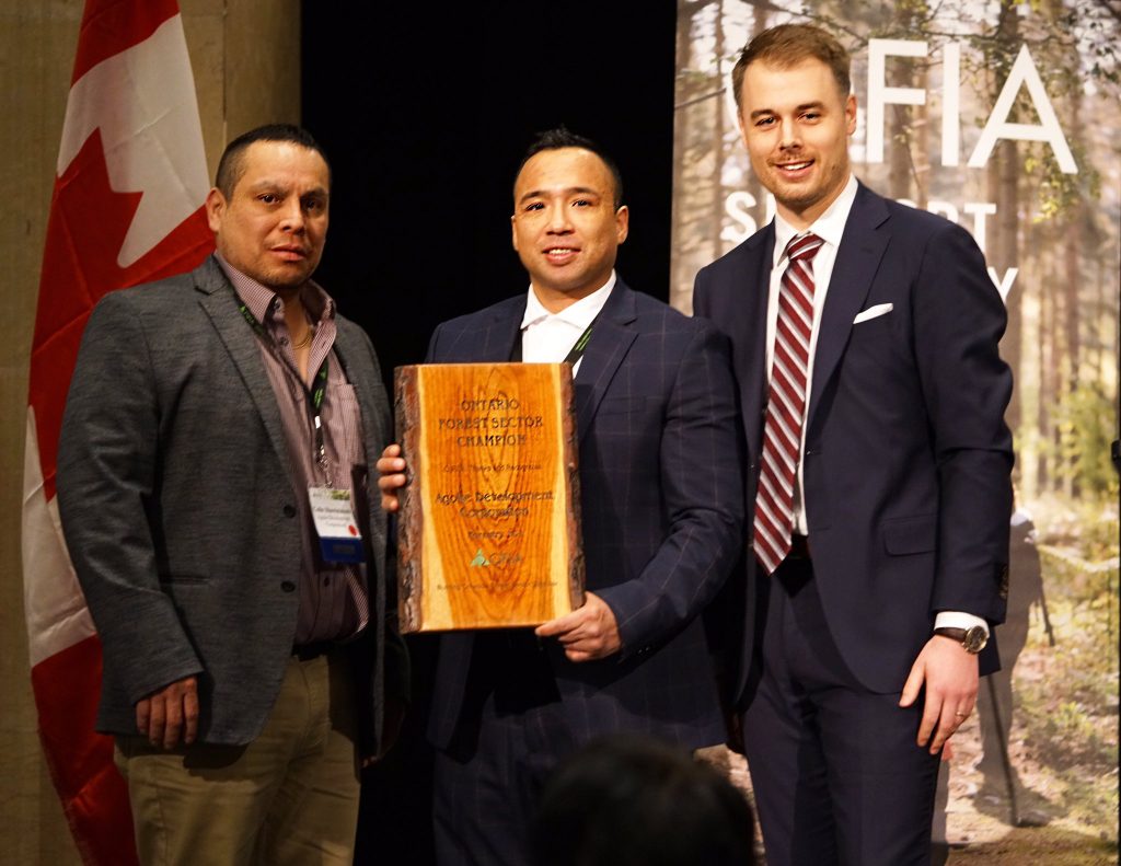 From left, Colin Shawinimash and Jason Rasevych receive the OFIA's Forest Sector Champion Award from OFIA's Ian Dunn. Photo source: Twitter/@idunn123. Agoke Development Corporation, a forestry company owned by the First Nations of Aroland, Eabametoong and Marten Falls in northwestern Ontario, has received the Ontario Forest Industries Association’s (OFIA) Forest Sector Champion Award.