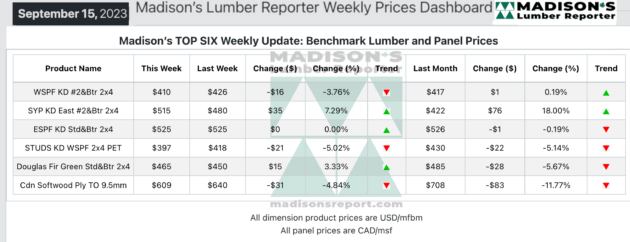 In the week ending Sept. 15, the price of Western S-P-F 2×4 #2&Btr KD (RL) was US$410 mfbm. This is down by $16, or four per cent, from the previous week when it was $426. That week’s price is down by $7, or two per cent, from one month ago when it was US$417 mfbm.