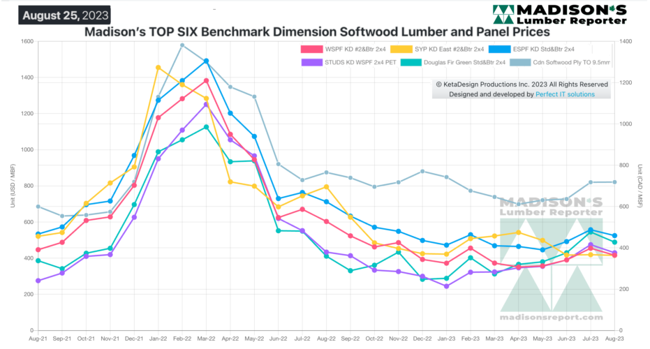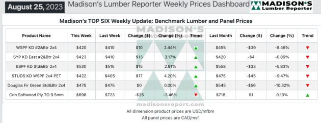 In the week ending August 25, the price of Western S-P-F 2×4 #2&Btr KD (RL) was US$420 mfbm. This is up by $10, or two per cent, from the previous week when it was $410.