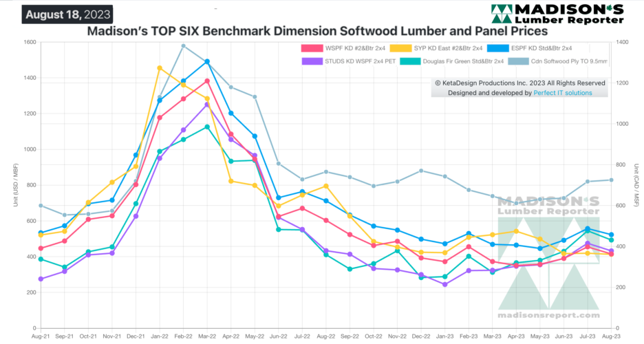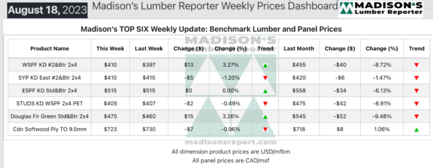 In the week ending August 18, the price of Western S-P-F 2×4 #2&Btr KD (RL) was US$397 mfbm. This is up by $13, or three per cent, from the previous week when it was $397.