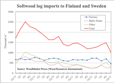 Softwood log trade in the Baltic Sea region has declined steadily for the past five years. In the 3Q/18, the total softwood log imports to Finland and Sweden reached a 15-year peak at 2.5 million m3 for the quarter and have since trended downward to just over one million m3 in the 1Q/23 (see chart). Over the past year, trade flows to Sweden from neighboring Finland and Norway declined the most, shipments from Sweden to Finland and from Latvia to Sweden showed slight increases.