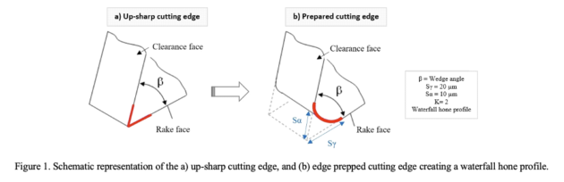 The edge preparation modifies the original up-sharp geometry of the cross-section of the cutting edge as illustrated in Figure 1. The waterfall profile was used on the test circular saw blades because this edge prep has shown to be highly effective in absorbing the shock of interrupted cutting applications.