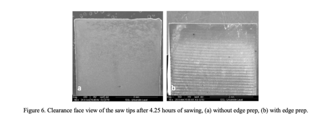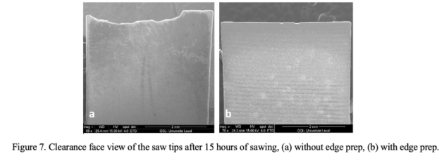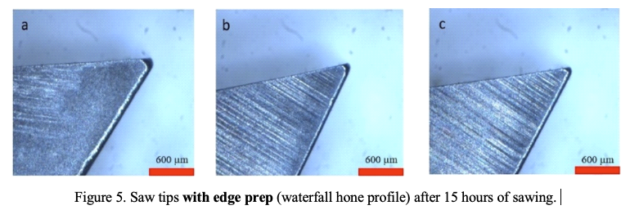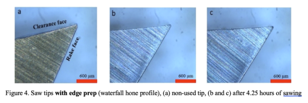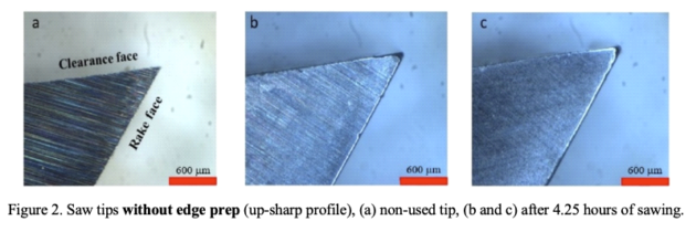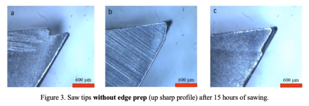 The photos in Fig. 2a, 2b, 2c, show that most of the saw tips without edge prep had small chips at the edges at the 4.25-hour sawing time.
