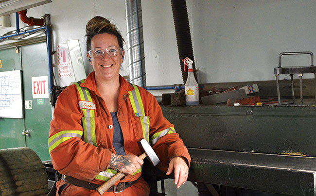 Sara Davies is a ticketed circular saw filer with Spray Lake Sawmills in Cochrane, Alta. Photo courtesy Sara Davies.