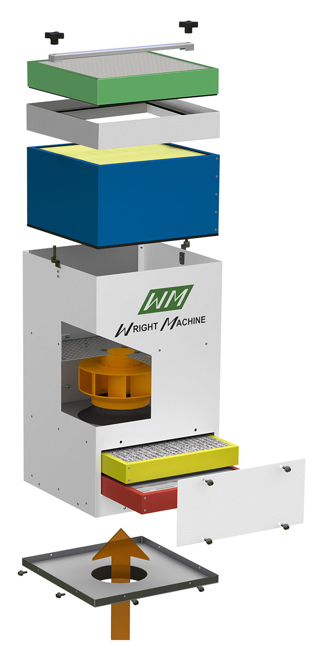 The MC-1000 mist collector is a compact unit with superior performance. The unit direct-mounts onto the sharpener and uses fibre bed filtration that is ideal for high pressure coolant and oil applications. Collected liquids drain back into the machine. The first stage mechanical element separates 90 per cent of mist and swarf. The second stage de-mister element supports the first stage with a washable filter. The third stage fibre bed mist filter captures small mist particles, rated MERV 15. The fourth stage HEPA filter captures submicron mist, smoke, and bacteria. The HEPA filter uses exclusive heavy-duty filter media for the most hold and longest lasting filter on the market.
