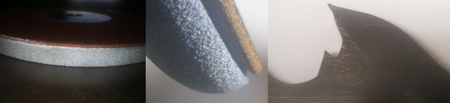 Left to right, grinding wheel and cutting disc glued together; notch cut between wheels; finished frost-notch.