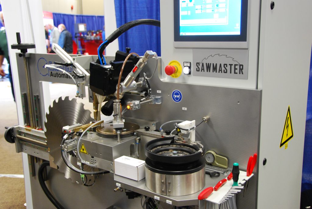 HMT Machine Tools Canada’s booth at the show featured the latest updates to the Gerling Sawmaster automatic tipping machine. The machine is designed for automatic brazing of pre-tinned carbide and stellite tips onto circular saw bodies for the primary wood industry. The Sawmaster is now outfitted with a laser tip sorting system that has allowed for faster