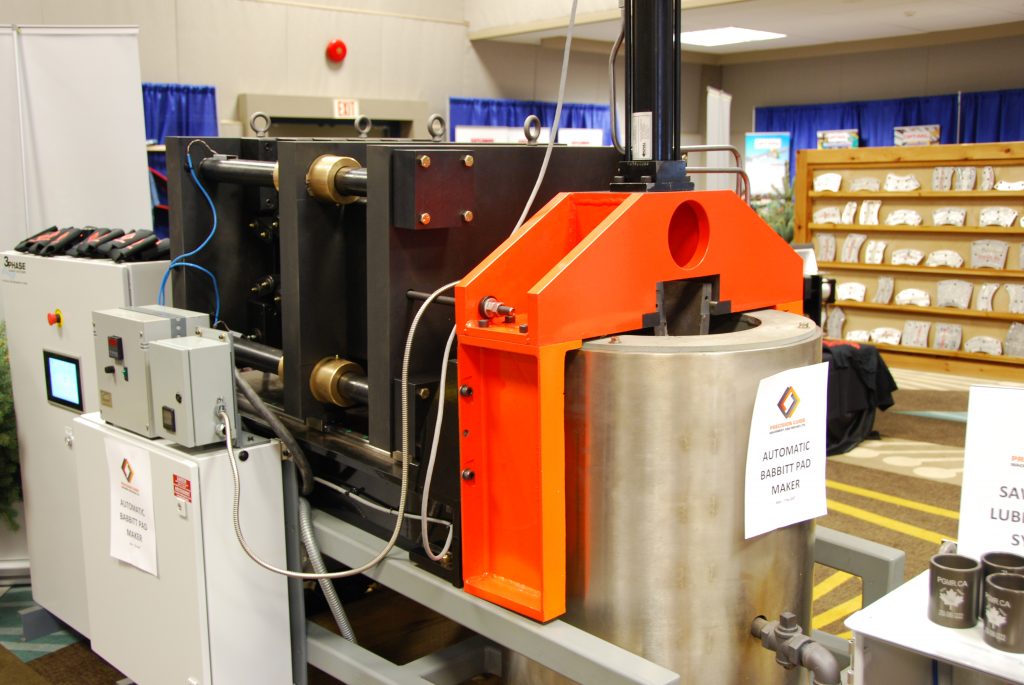 Precision Machinery debuted its automatic babbitt pad maker at the show. The machine process is prompted through the HMI. Once started the machine brings the pot and die plate to temperature and begins moulding guide pads. The machine can be placed unsupervised in a ventilated room to reduce the hazards associated with fumes. Die plates can be changed, allowing the mill to produce pads for all guide centres with one machine. The entire automated process improves safety for all filing room staff, and eliminates the risk of steam explosions and fume inhalation.