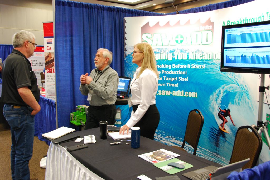 Saw-ADD introduced its new saw and guide force sensing system for circle saws at the show. The Round Saw-ADD measures the radial forces on the round saw blades from the tooth cut and the guide friction and, if excess forces are sensed, pre-emptively slows the feed speed to avoid deviation and saw damage.  Saw-ADD integrates force sensors on the saw arbors to sense the directional radial forces. These forces are detected nearly a half second before the arbor current increases which enables the feed speed to be reduced before sticking a cant, damaging saws or saw blade deviation. Round Saw-ADD is now running at Interfor, Adams Lake division on their Optimil 10-inch VDAG, producing better than expected results, with increased throughput of 12.6 per cent shift average cutting frozen Douglas fir.