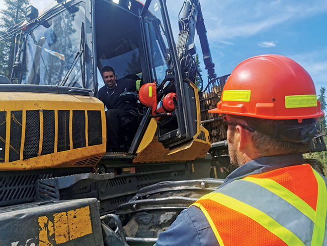 Michel Bouchard, AGIR’s general manager, talks with one of the operators in the field. Photos by Guillaume Roy. In northern Lac-Saint-Jean, Que., a community forestry model is generating significant income for small municipalities while promoting social acceptance of the industry.