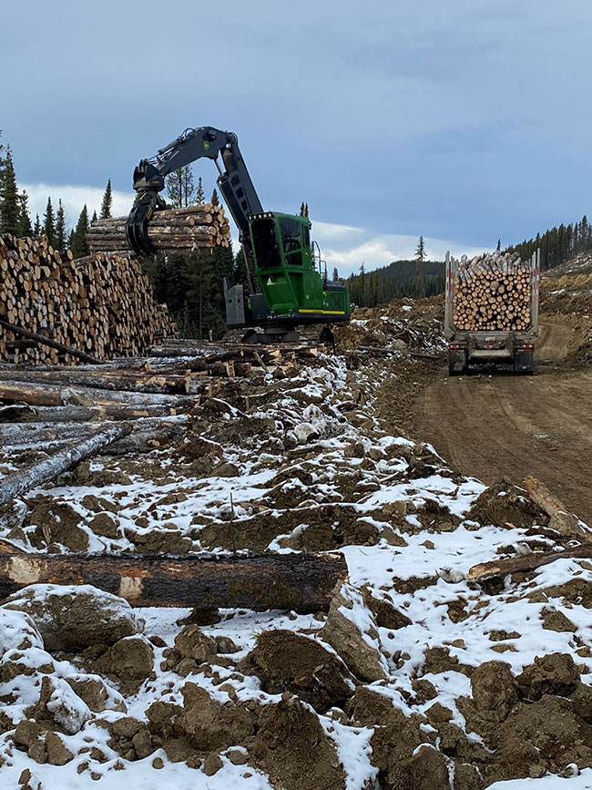 But, Dickinson actually downsized his fleet recently. Two years ago, he was logging for Weyerhaeuser in Grande Prairie. When he came back at the end of 2019, he sold off 26 pieces of equipment, most of which was parked, he explains.