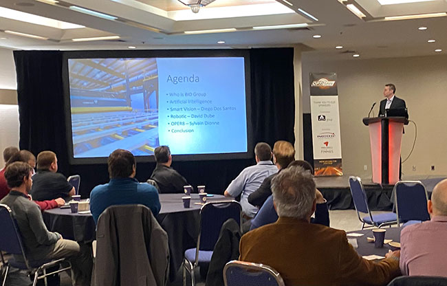 BID’s Diego Braido dos Santos, David Dubé, and Sylvain Dionne showed the crowd of 50 delegates and exhibitors some of BID’s innovative technologies, including AI and robotics and their individual impact on operations such as monitoring and optimizing process flow in sawmills and planer mills.